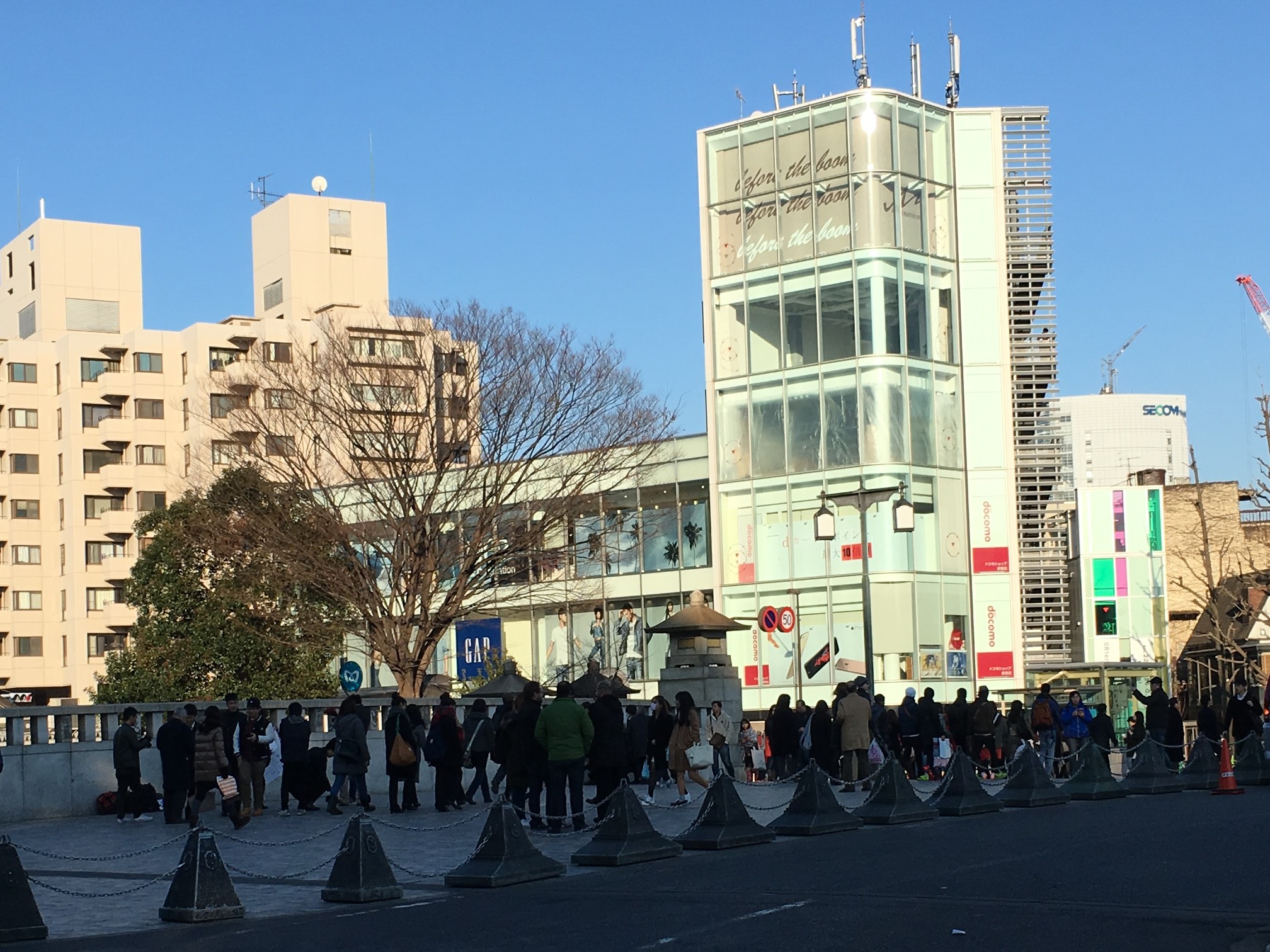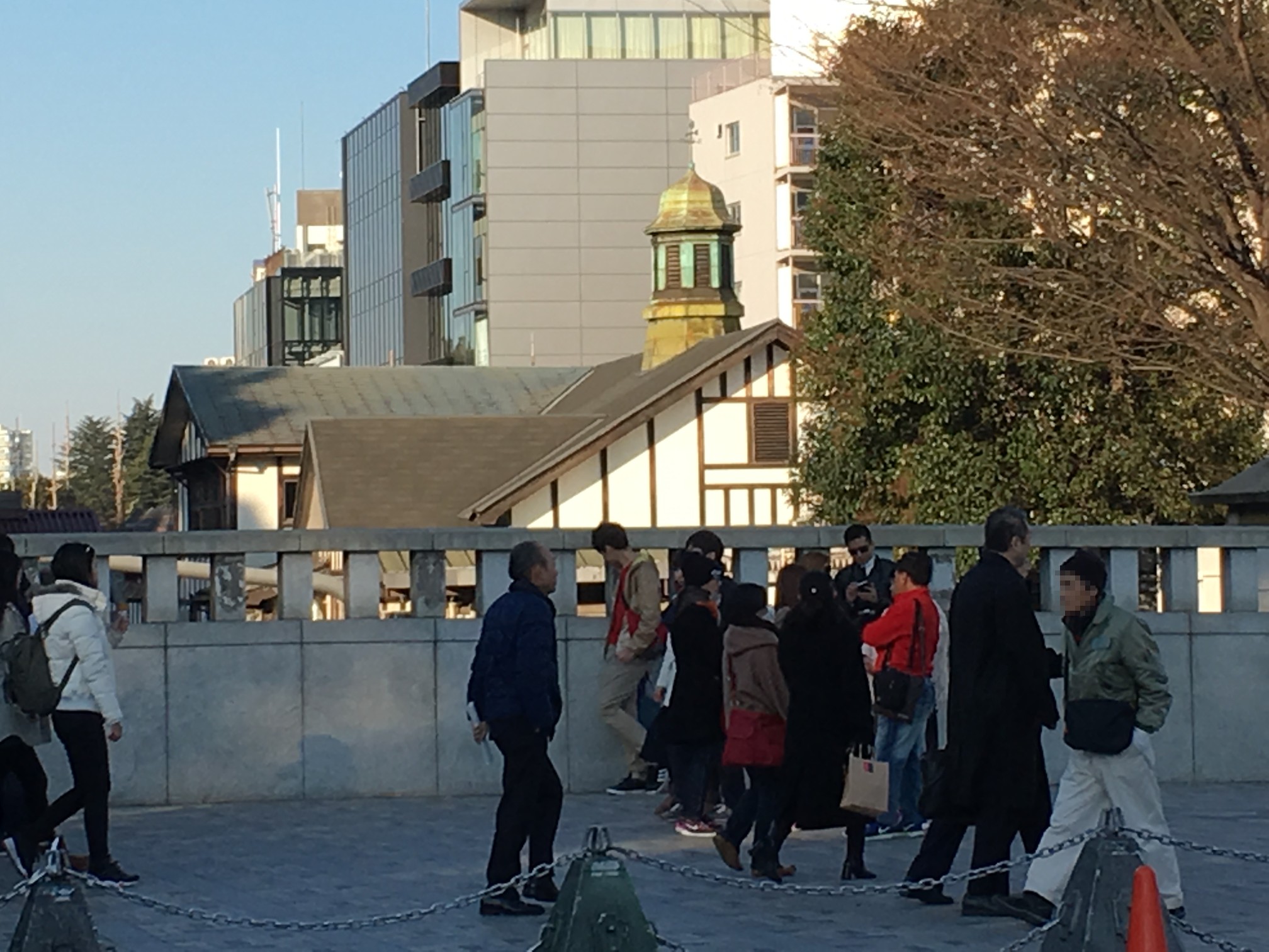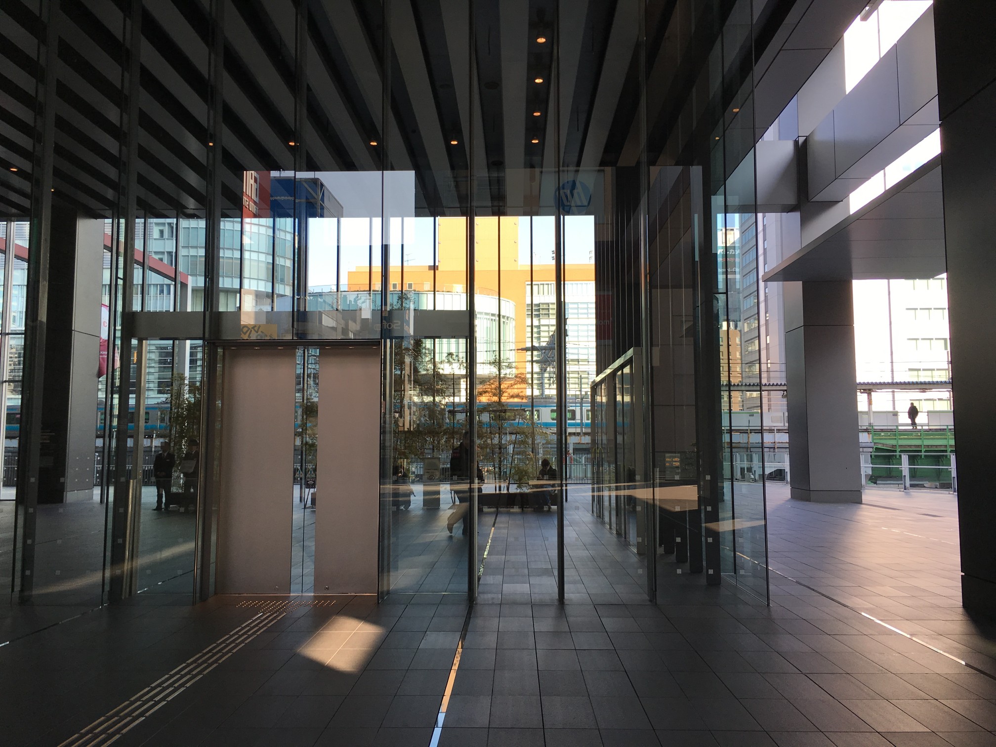 真ん中の丸い建物自体は特定していたのですが、ガラス面に反射しているんだと思っていて、東側通路で入口とその建物がいい感じに写せるアングルが無いか探していました。