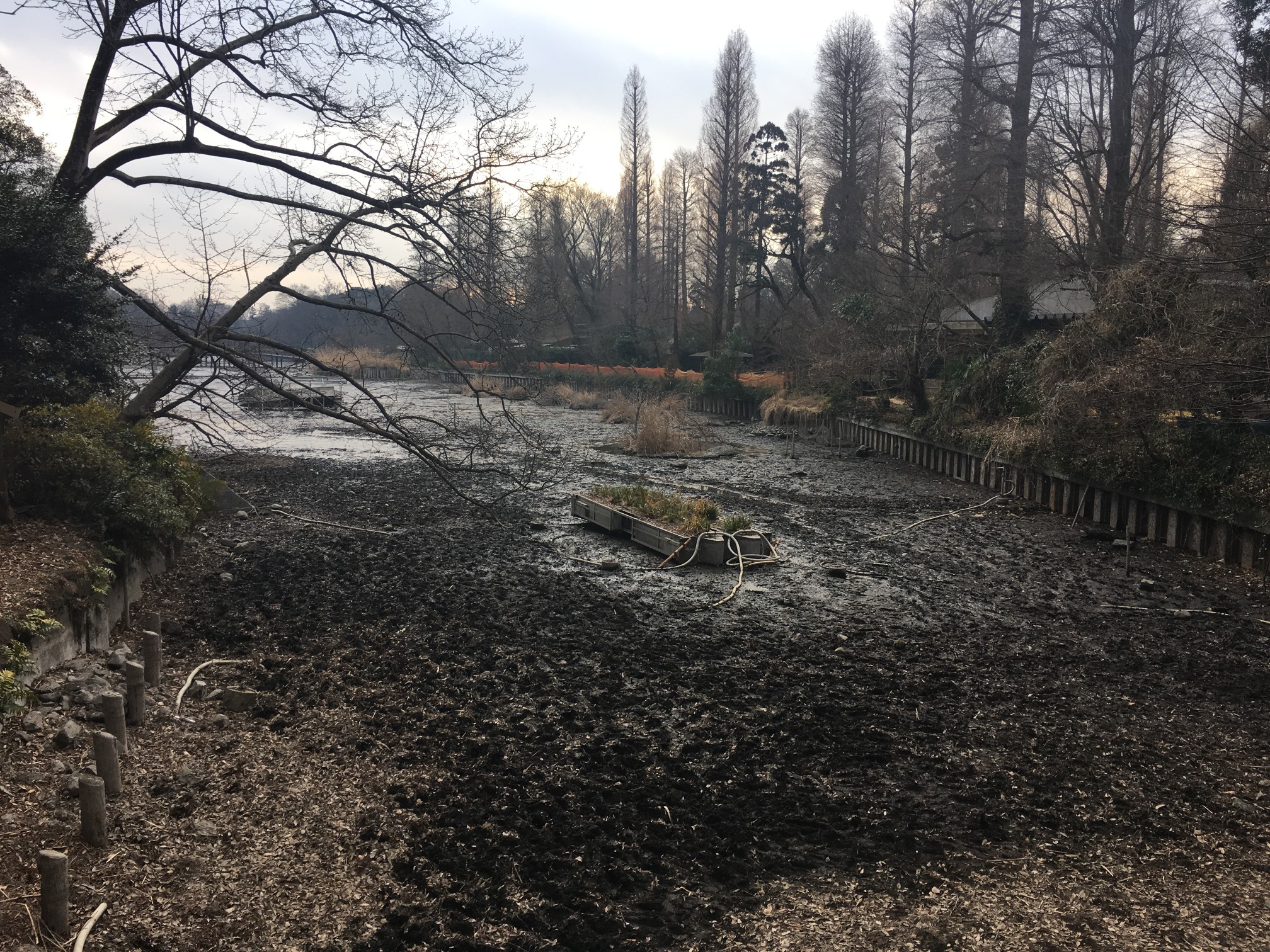 で、勧誘するシーンを回収したので、ボートがいくつも浮かんでいるカットも撮りに行こうと公園内を歩き回っていましたが、ご覧の通り、池の水が抜かれていました。