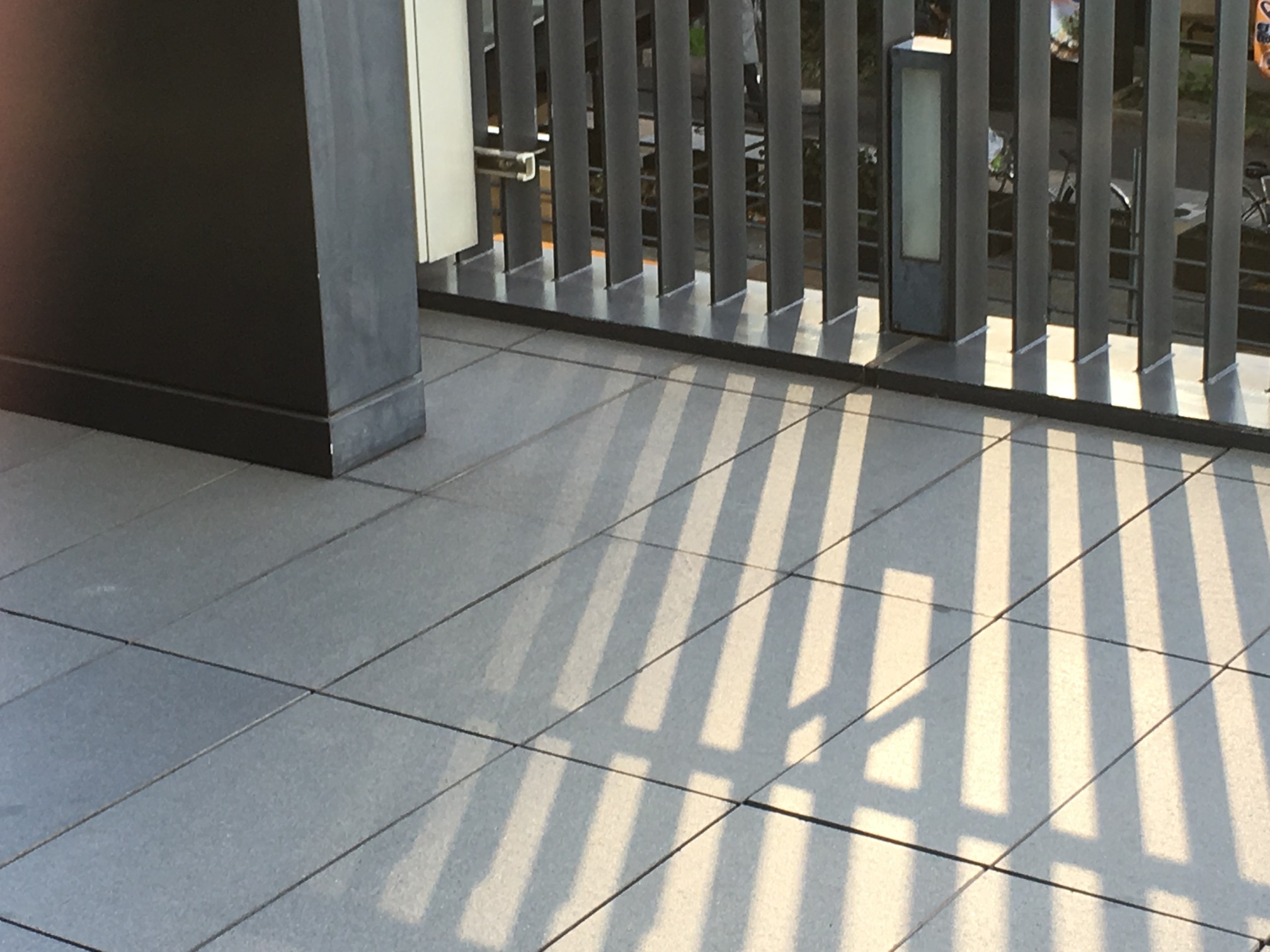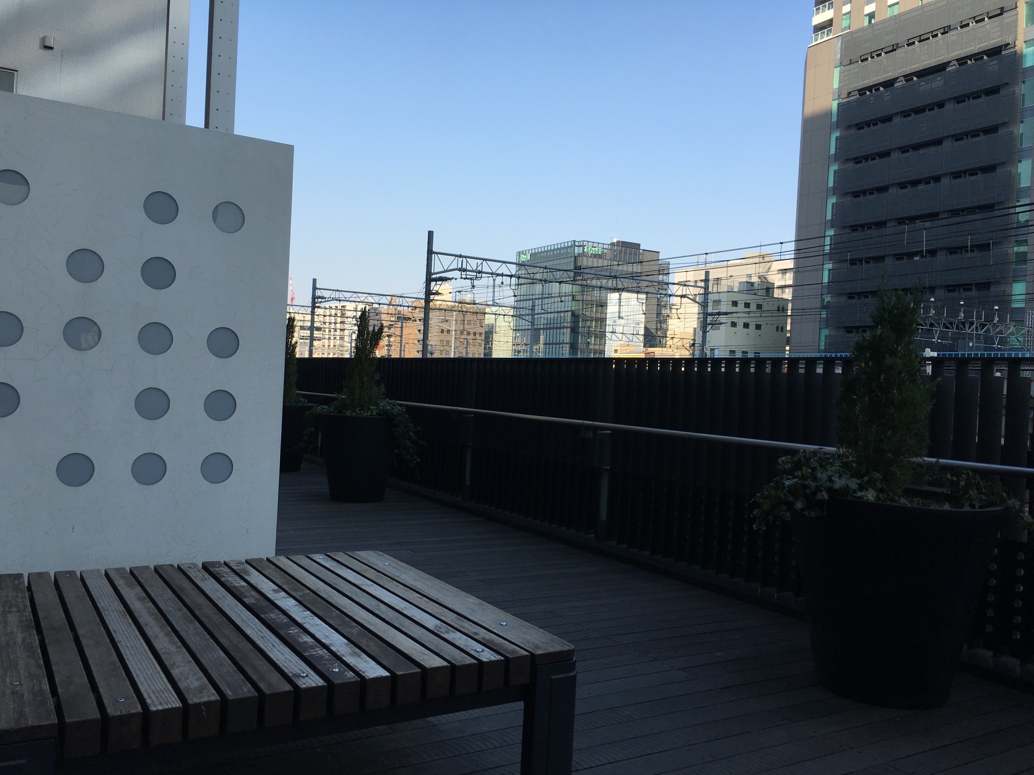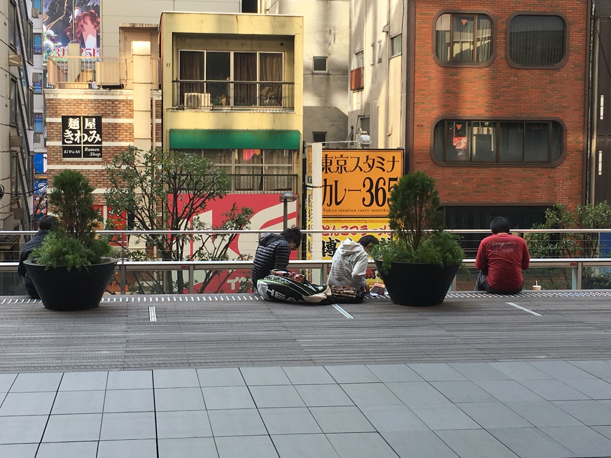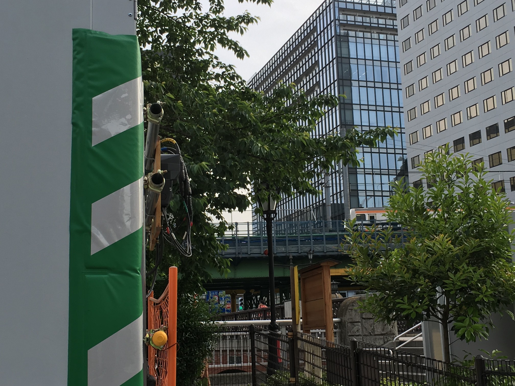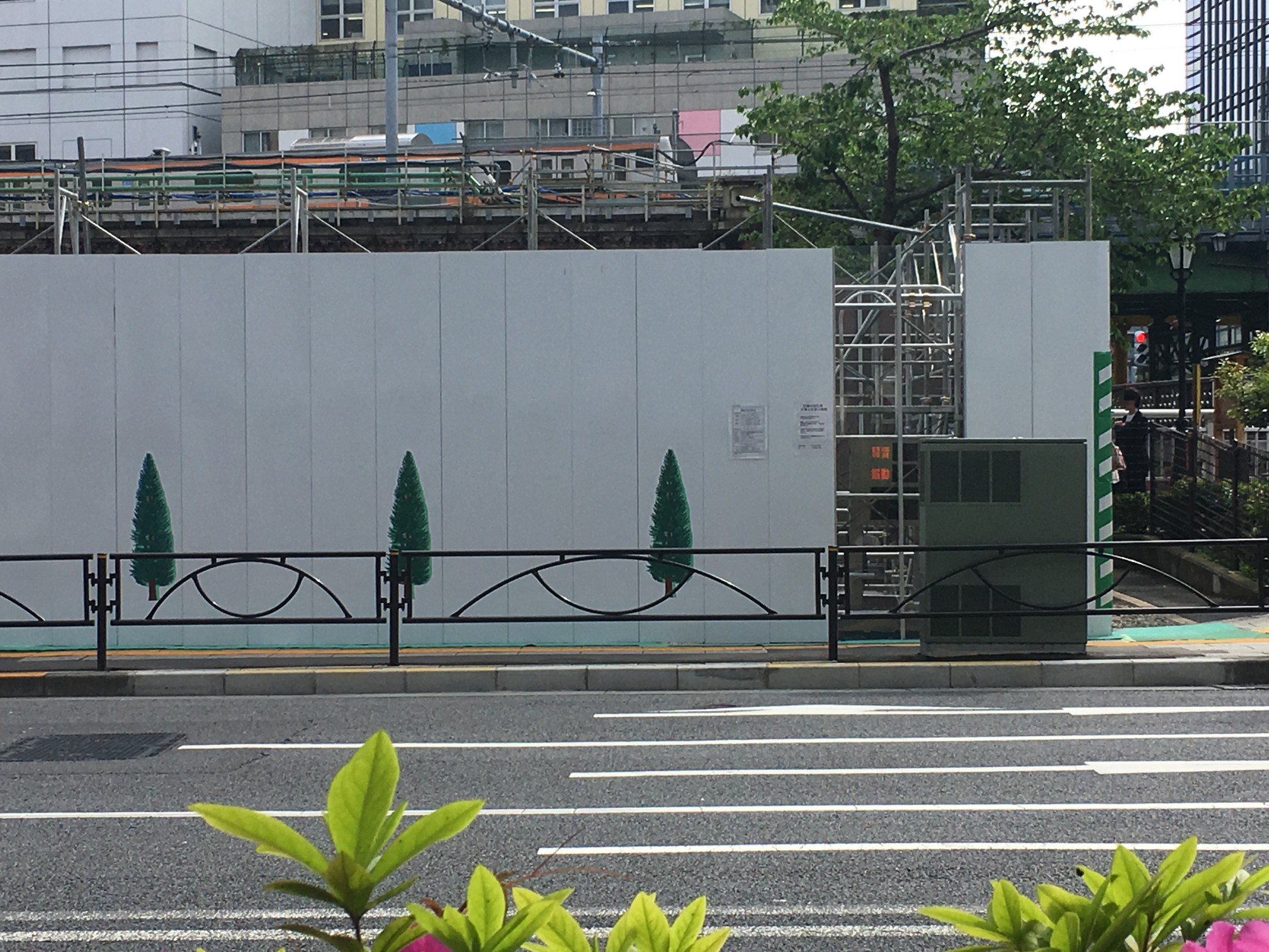 で、作中背景右側の緑は、最初手すりの向こうの街路樹と思ってたんですが、そんな高さのある木は生えてなくて、実は手すりの手前、プランターに植えてある小さな木でした。